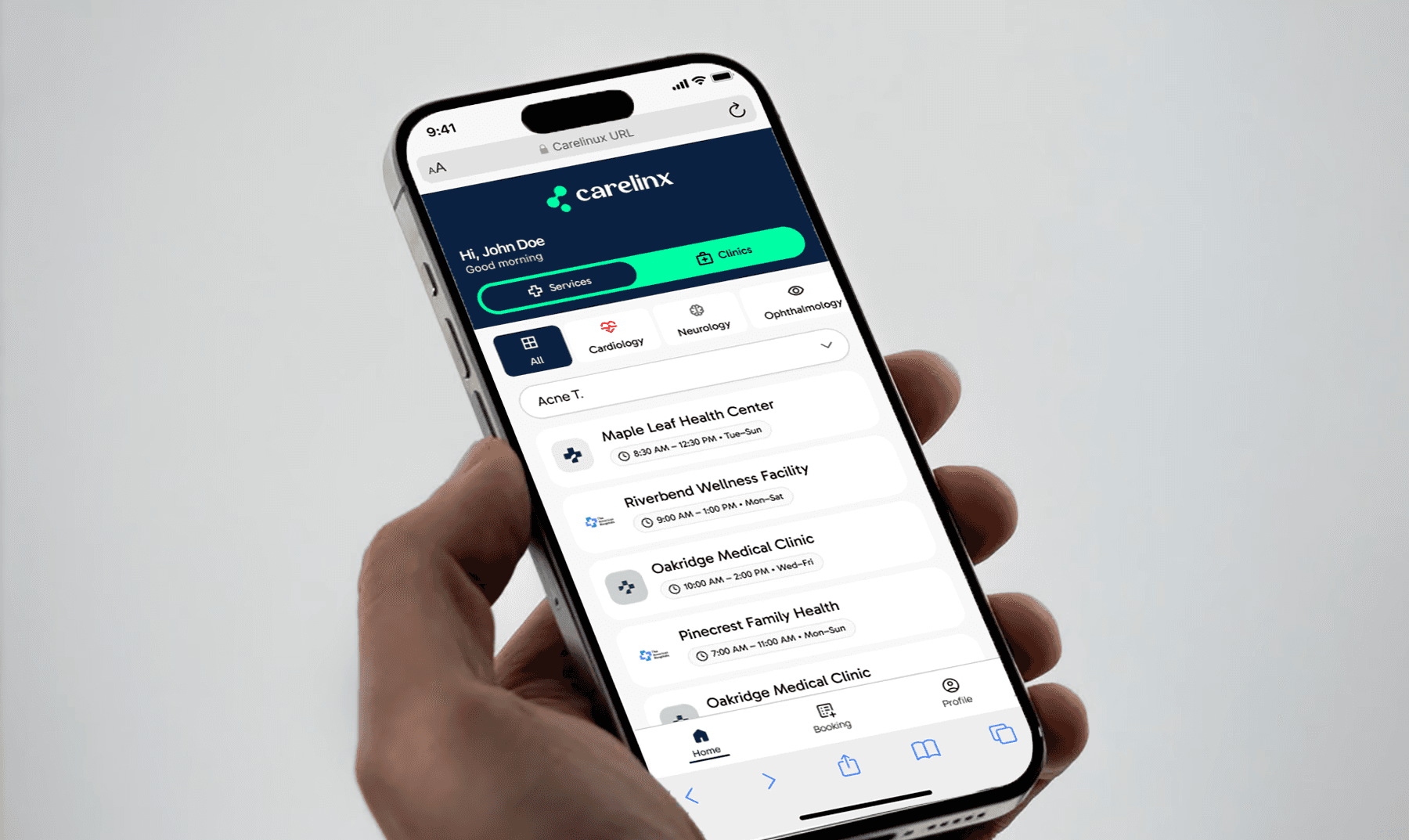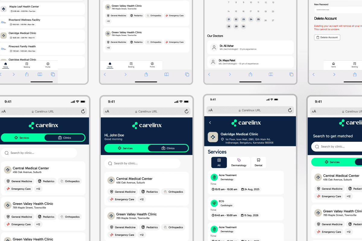 Carelinx is a healthcare platform that enables patients to easily book clinic appointments based on their specific needs. Users can browse clinics, compare doctors, view availability, and select convenient time slots—creating a smooth and transparent booking experience.I designed both the patient-facing flows and the back-office dashboard, focusing on accessibility, trust, and clarity. My approach involved user journey mapping, competitive analysis of telehealth platforms, and testing multiple scheduling scenarios to ensure usability across diverse user groups.