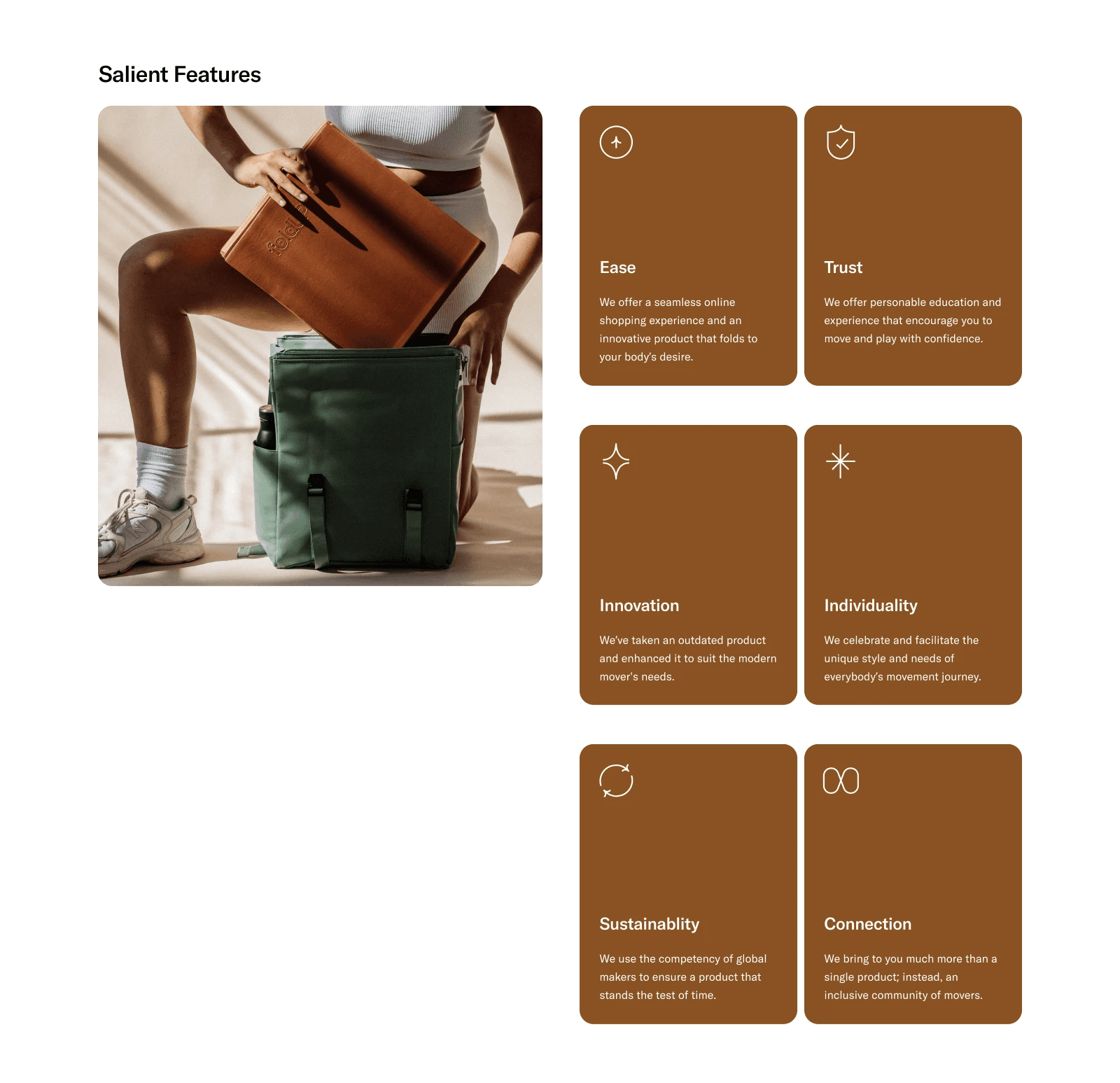A lifestyle‑driven visual design uses warm colors, spacious layouts, and real‑world imagery to communicate comfort, movement, and mindful living without a hard‑sell feel.