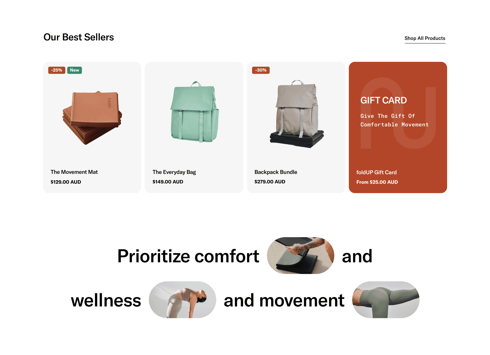 FoldUP is a direct‑to‑consumer eCommerce platform focused on wellness, comfort, and mindful movement products. The website is designed to showcase products such as bags, accessories, and lifestyle essentials while communicating a calm, premium, and trustworthy brand identity