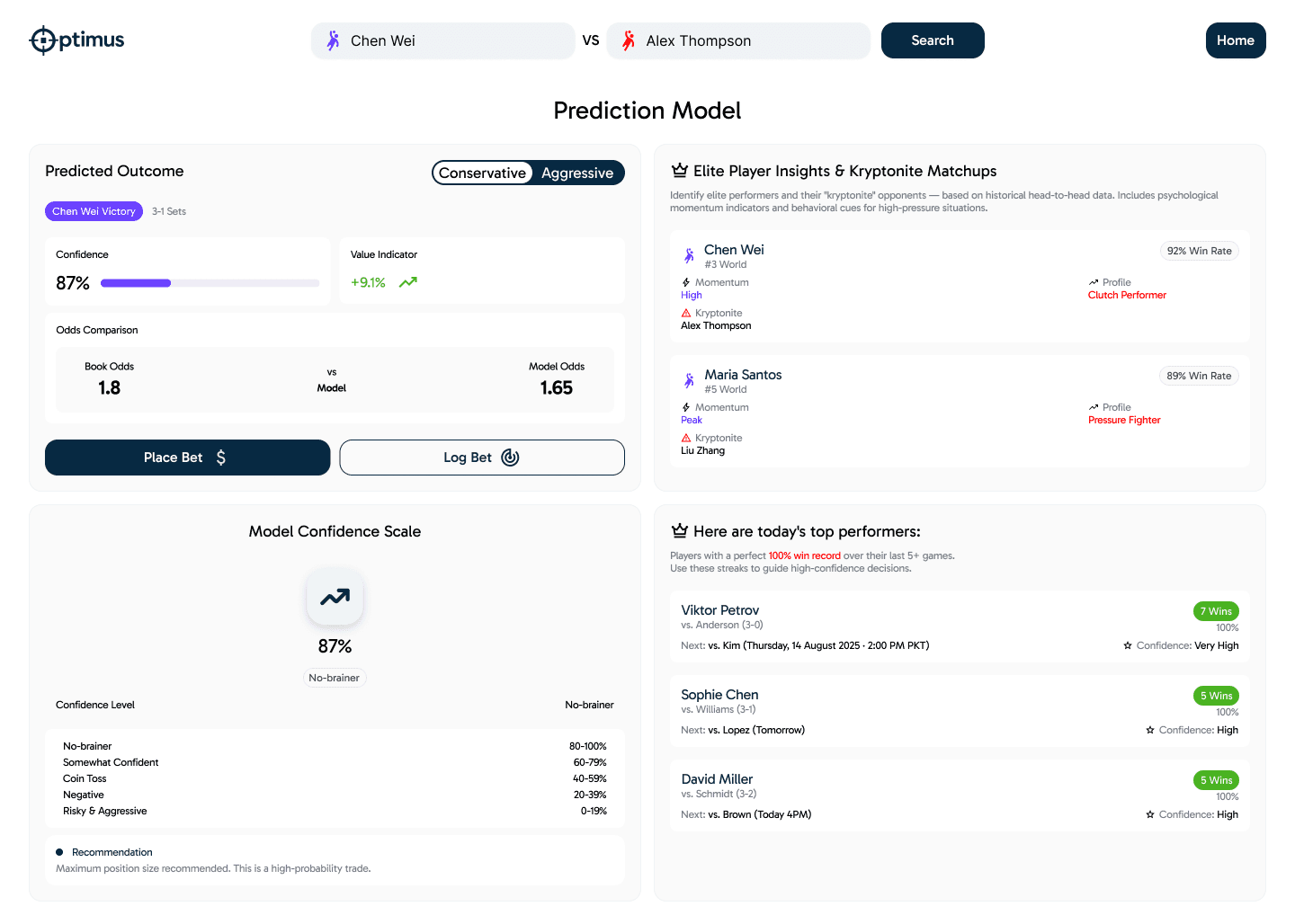 Optimus is a sports analytics platform that provides instant, data‑driven insights into table tennis players worldwide. Users can search for any player and access detailed match histories, performance statistics, strategic tendencies, and AI‑powered winning probability predictions.As the UI/UX Designer, I created an interface that makes complex sports data both engaging and easy to digest. The goal was to transform raw analytics into interactive, narrative‑driven insights for fans, coaches, and professional players. My process combined sports research, UX best practices, and iterative visualization testing to ensure clarity and excitement.
